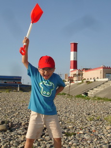 三寶帶了挖砂的鏟子走向海邊,心情有些興奮。
