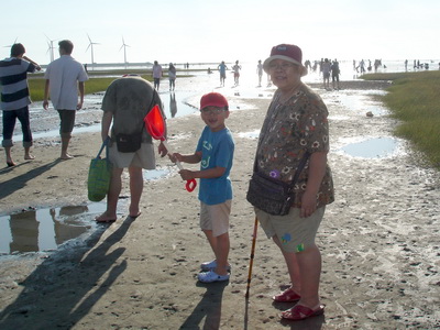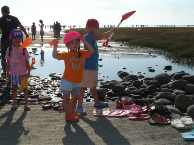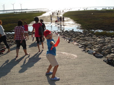 一波波的人潮都順著一條小路走向海去,路旁擺滿了各式拖鞋及涼鞋,大家幾乎都是光著腳ㄚ子走進去,我們不習慣光腳,所以都是穿著布希鞋,原本還擔心容易滑,結果在濕地上,一點都不滑,鞋子反而還會被泥巴給黏住。