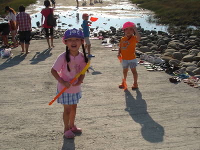 三寶不敢伸手去抓螃蟹,其實爸爸也從沒抓過。只是在孩子面前總要表現得很厲害的樣子,所以很努力也抓了幾隻,讓他們放在鏟子上玩。其實仔細觀察螃蟹的動作就很容易掌握了,那些在只敢在洞口附近徘徊喊著「來抓我來抓我」的螃蟹根本不用去理它,人的速度一定比不過它們,所以只要看準那些稍微走遠的螃蟹,快速地擋住洞口前的路,也不用特意去挖,螃蟹就手到擒來了。