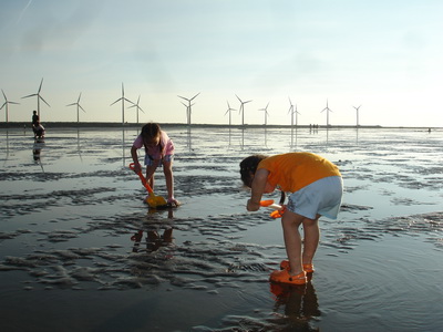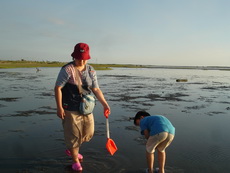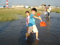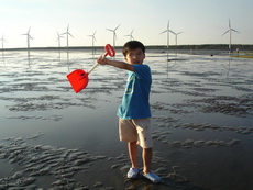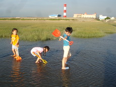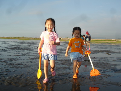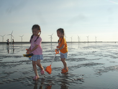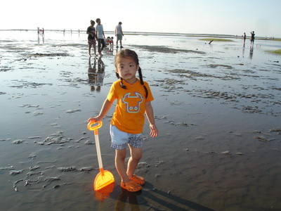 濕地的深淺隨每日的潮汐均不同,今天最淺時刻是四點半,正好是在我們到達前。不管乾地或濕地,到處都可以看到一個個小洞,而且隨處都有小螃蟹的蹤跡,在我們的腳邊,也不時會冒出小螃蟹,這些小傢伙好像在挑釁每一個遊客,讓人有很想挖它的慾望。不過真地要去抓它時,才發現並不容易,一隻隻的螃蟹就在洞口不遠處,只要有人一靠近,就趕緊溜回洞內。用手指鑽進洞內,又抓它不著。