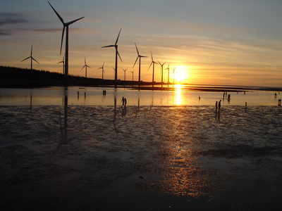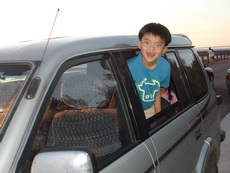 在海中濕地玩了好久,太陽還是沒有落下的跡象,看來不太可能等到黃昏,所以就往回走了。大夥上車後,覺得到此一遊,還是不宜錯過黃昏的美景,所以在路旁等了一回,終於等到太陽落下了。