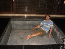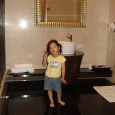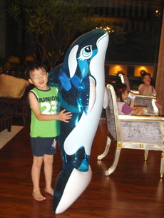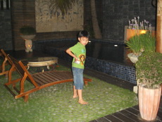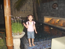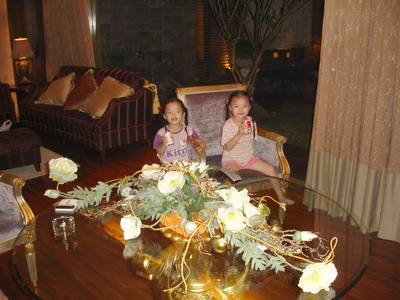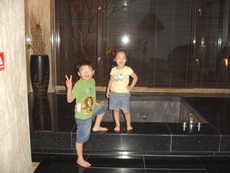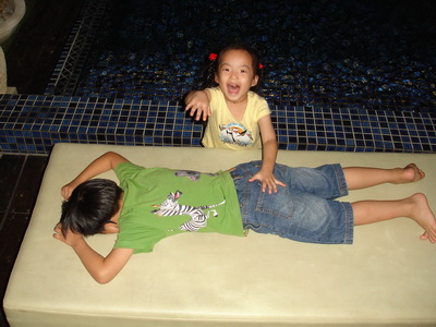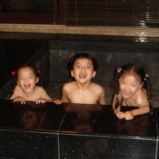 三寶很快地發現了還有戶外,也有游泳池,迫不及待問道可以游泳嗎?我們拒絕了,要求他們隔天才可以去玩,怕的是戶外晚間的水溫會太冷。只有管不動的阿公率先下水,又冷到爬出來泡進浴缸裡猛放熱水,讓我們又生氣又擔心他要中風了。