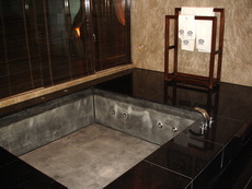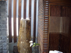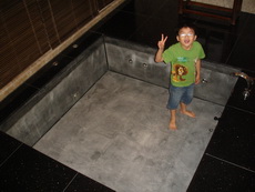 三寶跑進廁所及浴室,哇地驚呼聲此起彼落,二片格子的木頭旋轉門,格子間都是透明的。馬桶與洗手檯的空間距離估計超過五公尺,兩處淋浴的角落,水甚至高高地從天花板灑下。而像是溫泉般的浴缸,讓三寶和爸爸都趕緊跳下去體驗一下。