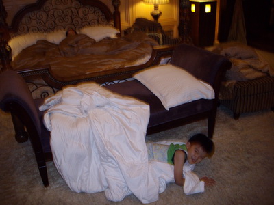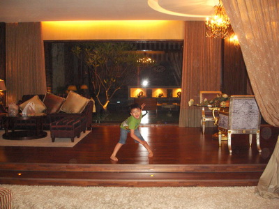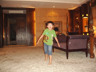 車子開進停車庫,分三批乘坐電梯上到三樓,一打開房門,三寶先是一愣,大概還以為這裡仍是大廳, 不敢隨便亂開門或亂走。等到一再確認這間就是我們要住的房間後,就開始在裡頭奔跑起來。大門進來的地板鋪了厚厚長毛的地毯,裡面加高的木頭地板則是接待的客聽及餐桌。