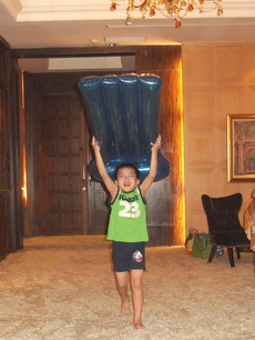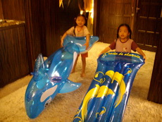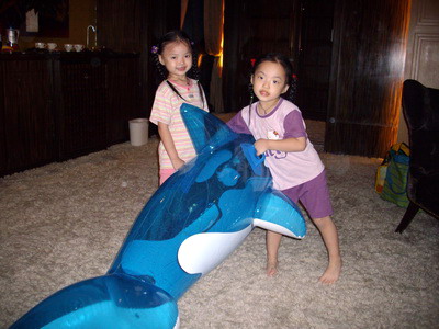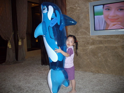 除了海豚,還帶了一張充氣浮床來,事實上,連打氣筒都帶出門了。
