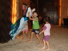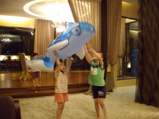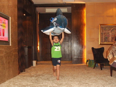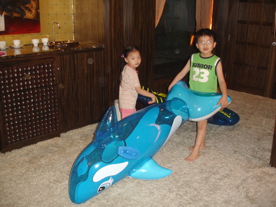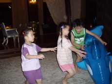 寶寶只有簡單吃了一點東西後,就顧著去玩了。為了今天,爸爸特別買了一隻充氣的海豚,海豚是寶寶最喜歡的海裡生物,又是藍色的,讓他特別興奮。雖然還沒進游泳池,也已經充好氣讓寶寶去玩了。他把海豚頂在頭上,從房間的一頭跑到另一頭,有時海豚會飄飛起來,有時海豚會摔落地上,寶寶也就隨著海豚在地上滾來滾去,寶寶在看電視的阿婆眼前,一趟又一趟地來回奔跑。阿婆說:寶寶已經玩到瘋了。