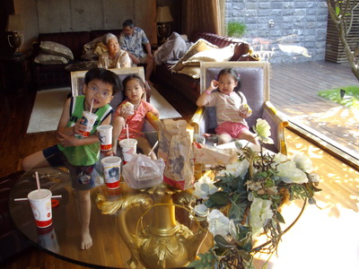 第二天一早,旅館便將七個人的麥當勞早餐放在車庫。車庫裡還有個裝置,當有餐盤放上去時,會壓住一個開關,此時隨扈房內便會亮起『早餐送達』的字幕燈,真是總統套房才有的專屬設計。只是住在隨扈房裡的爸爸和蓉蓉還在睡大覺,所以只好麻煩大房間裡的主人下樓去領早餐,順便來叫隨扈起床吃早餐。