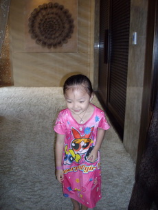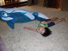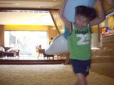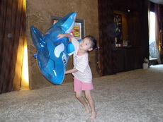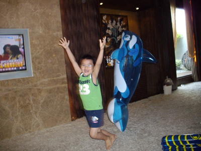 早餐時間,三寶又在室內持續前一天的遊戲,讓海豚變成飛機在房裡飛來飛去。