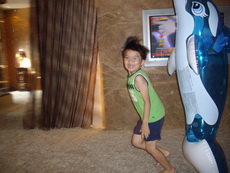 住這間汽車旅館的最大好處是,整個早上的時間,都可以待在裡面玩,不用趕行程,況且裡頭也比外面還好玩。記得昨天晚餐要帶東西進來時,寶寶還很納悶:『為什麼要在旅館裡吃飯,我們可以check-in後,再開車出去吃』。之後逗著要帶他出去吃,他改說:『我才不要出去』