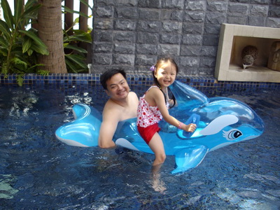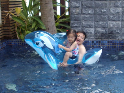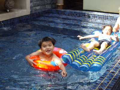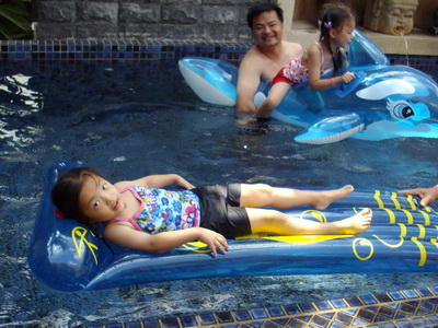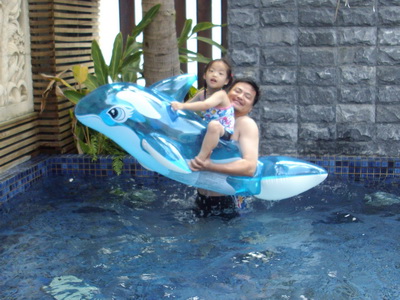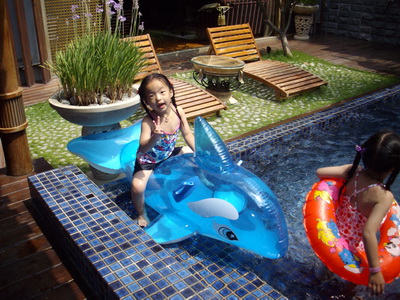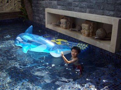 終於所有的充氣設備都下水了。水深九十公分,不過三寶都不會游泳,所以還是得大人全程陪玩。