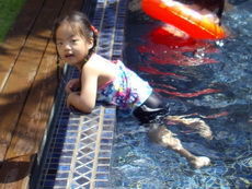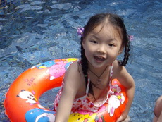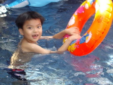 寶寶套上游泳圈,其實他的腳都能著地,可以用腳踩著池底到處走。