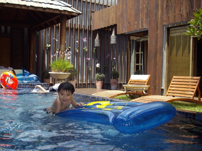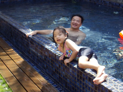 從室內看戶外的游泳池,就讓人很想立刻出去玩。不過打算稍等到太陽曬到池邊後,池水溫度高一些再下去游。