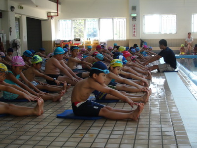 白天的上課方式,已經非常熟悉。約上課前三分鐘到達榮富國小游泳池,做十五分鐘的體操,小朋友便各自分組到自己所屬組別的區域去集合。共有六個教練所以分成六組,教練會依人數安排,八、九級的在一組,七級的在一組…沒學過的初學者在一組等等。寶寶雖然是三級,但所屬組別裡卻是一級、二級及三級都有。
