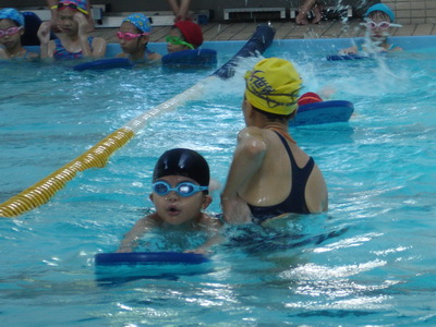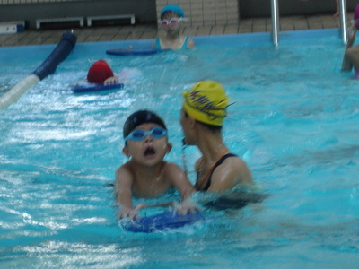 於是,從上週六下午去了第一次,地點是家裡附近的新泰游泳池,價格還算便宜,整體感覺也不錯。之後星期一開始,便天天帶著寶寶去報到,同時配合白天練習的項目,也讓寶寶買了個浮板去練習。帶著浮板,他更想去了,每天一吃完晚飯就急著把泳褲換好,催促著爸爸要出門了。
