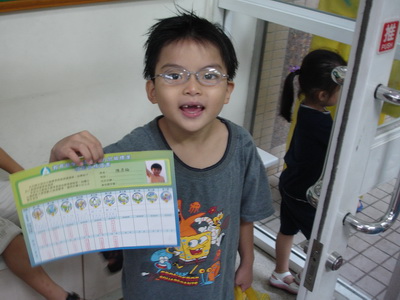 課後爸爸趕緊到櫃檯找寶寶的檢定表,找到檢定表一看,再一次嚇了一大跳,上頭的印章蓋到了六級。恰好有認識的小朋友媽媽對爸爸說:阿婆正在游泳池外面等,於是也趕緊出來向阿婆報告成績,遠遠地對著阿婆,用手指比出六,阿婆也露出驚訝及興奮的表情。上次一次過三級,有點不可思議這次居然又是一次過三級。