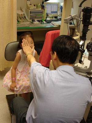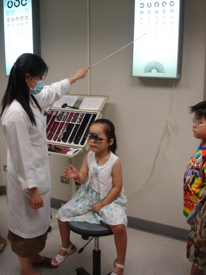 小潔比到一個程度之後,在看不清楚的那一排,就會亂比了,不過結果是她的視力最好,一年後再檢查;蓉蓉兩眼的散光相差約一百度,沒有近視,還算正常,半年後再檢查;寶寶的兩眼度數在每次的檢查之後繌是會亂跳,時好時壞,眼睛亂瞄的現象有好轉,仍需持續戴眼鏡矯正,兩個月後再檢查。