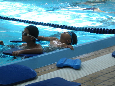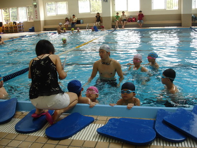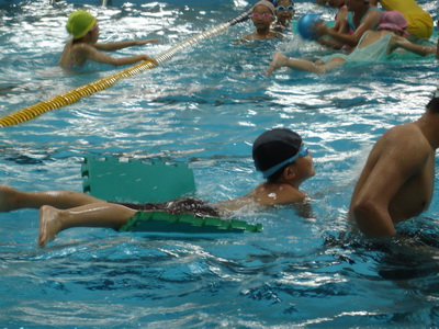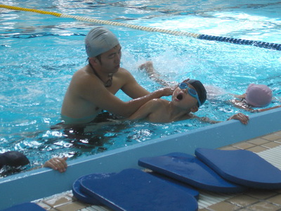 不過,若是因此而否定教練,也太不公平了。因為當小朋友一個個游出去後,教練便很注意每個小朋友的動作,而且,每一次他都會潛下水去,從水裡看小朋友踢腳的姿勢,然後給予個別糾正。最常見到的畫面就是,教練用手扳動小朋友的頭,讓小朋友的頭會往側邊方向轉,而不要向前抬頭。看來這位教練擅長個別的動作指導,而不習慣多人的理論講課方法。
