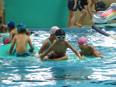 接著的幾天,多是自由式的練習,觀察漸漸發現,這個教練的時間運用還蠻緊迫的。他把學生分成三組,一次就是三個人同時游出去,因此游到對岸後,沒能有太多休息,就得馬上再游回來,學生的練習次數變多了,教練也挺忙的,而且游到後半段,大家好像都被操得沒了力氣。大概也是為了舒緩一下疲勞,教練也開始教大家把浮板抱在胸前,用仰式的方式前進。小朋友們似乎長時間練習自由式,換了種姿勢都興奮起來,寶寶的第一次的仰泳還蠻順利的。