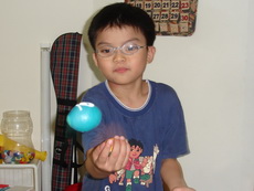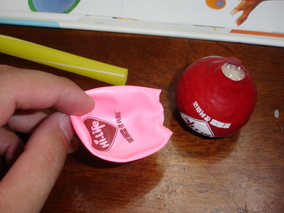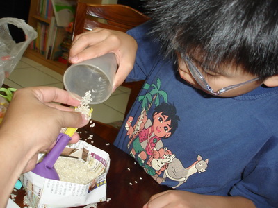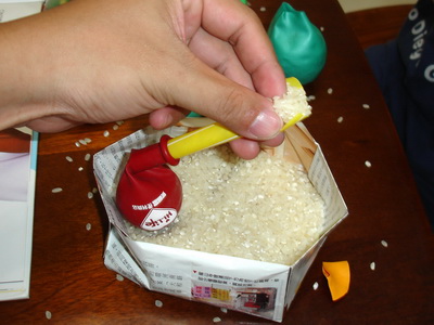 灌入的方法可以先用一根粗吸管插入氣球中,比較方便灌,不過能夠裝得較滿較緊,效果也會比較好,於是爸爸想到一招,就是略微把氣球吹開,然後設法讓空氣流出來之前,先讓米掉進去。不過得小心處理,因為一不小心,衝出來的氣體,可能會把還在管子裡的米噴得到處都是 (因為我們有這個經驗啦)。