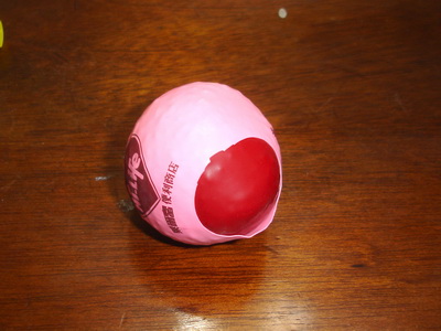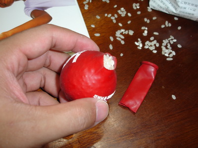 然後把第二個氣球拉開,口對口方向,套進原先裝滿米的氣球內,調整一下各處的彈性,讓它包覆得緊蹦一點。