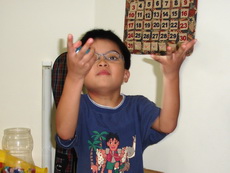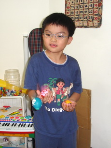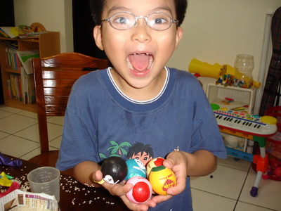 這樣就完成了,寶寶覺得裝米很好玩,所以他一直拿氣球裝米,最後一共做了五個砂包。