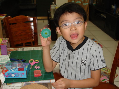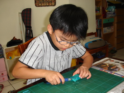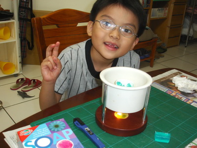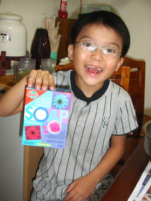 寶寶從深藏在櫃子裡的箱子裡找到了很久以前買的 DIY 材料包,這是手工肥皂,於是馬上就來製作了,原本蓉蓉和小潔也吵著要看,不過時間已經太晚了,只得要求她們改天等哥哥學會了,再教她們做。