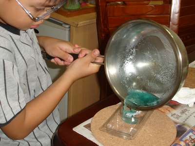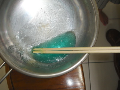 打電話詢問有製作經驗的阿婆,阿婆教我們直接用鍋子去煮就行了。於是改在瓦斯爐上煮,還是開小火,沒兩三下夫,只在幾秒的時間,就全部溶化了。(
