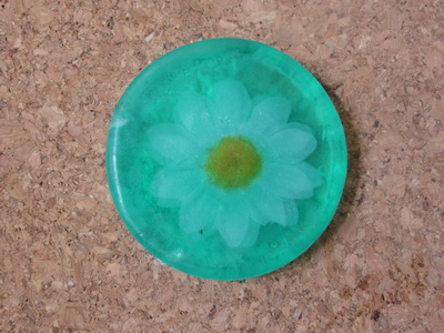 將溶解的皂基倒在模子裡。倒到一半時發現花放反了,又趕緊用筷子把它翻面,此時要避免有汽泡壓在裡面。