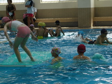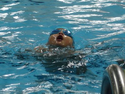 約略到了第三天,教練也開始教仰式了。小朋友學仰式好像都沒有太大瓶頸,兩三次的摸索中都能找到浮在水面的方法。漸漸配合著手划,慢慢的前進,沒有沖天炮的速度,卻和沖天炮一樣往各方向竄去。