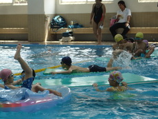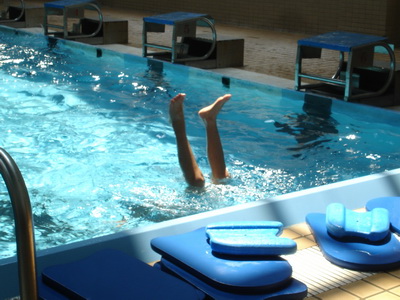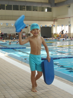 第一天上課,在重新調整組別時,已過六級的小朋友被分配到最裡頭的一區,水池較深,所以寶寶必須墊起腳尖站著才可以讓鼻子呼吸到空氣,偶而也得攀著池壁移動,看來好像初學者在水裡蹬呀蹬的。