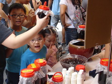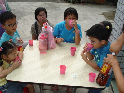 小朋友一喝完飲料,又迫不及待跑出去玩了。