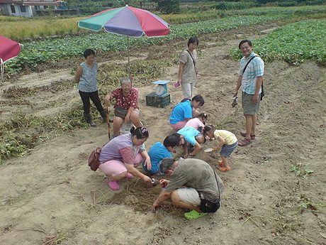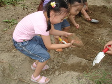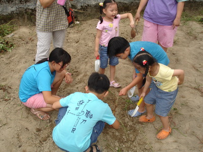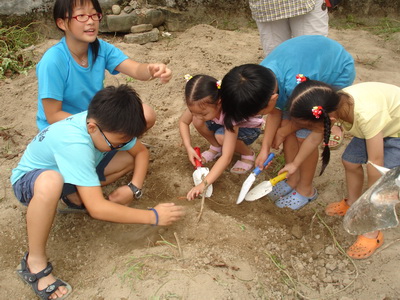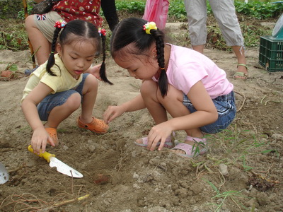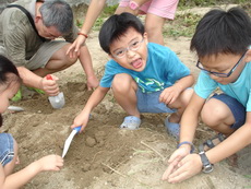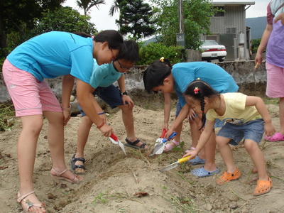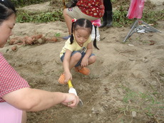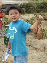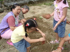 一開始大家先用鏟子把土挖開,待見到了地瓜,便用手將士撥開,並且試著把地瓜拉出來。