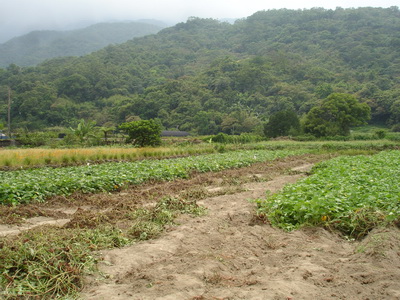 在台九線往旺旺地瓜園的入口處早已進行交通管制,因為金山地瓜的活動會場就在附近,路邊停車的長龍也排了數百公尺遠,遊客都必須下車步行前往。不過由於我們對此處的地理位置已很熟悉,先開到一條遠方的田間小路彎進去,繞過廢棄的遊樂區及工廠,在看似無路的山間小徑迂迴,然後就直接開進旺旺地瓜園的門前。