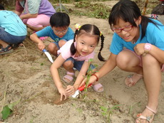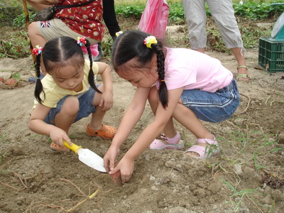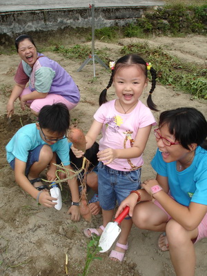 隨後便到田中開始挖地瓜的活動。婷婷和達哥都是第一次挖地瓜,於是便由老手級的三寶們負責解說,小朋友們都興奮得以致太過匆忙,常常一個鏟子下去,就直接挖進地瓜的肉裡,露出黃色的地瓜。