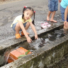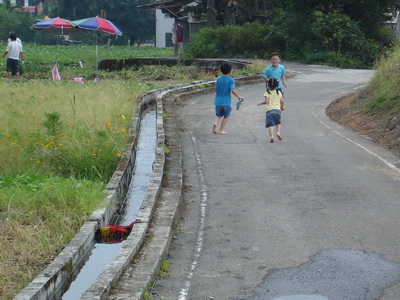一挖完地瓜,也沒問過大人,三寶們馬上帶領著婷婷和達哥去水溝玩水,仿佛這裡是自個家後院一般熟悉。