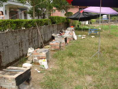 下午陸陸續續有其他遊客前來挖地瓜,也有路況不熟的人打電話來詢問,在賴媽媽引導下也從小路順利到了。也有遊客是安排焢窯的,現在田裡已經預先搭了幾座磚窯,以前用土搭窯需要三、四個小時時間,現在用磚窯只要一個小時就可以了。