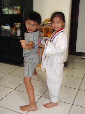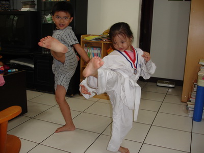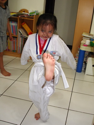 才藝班還沒有開始,穿上道服的蓉蓉一踢腳,還挺有架勢的哩。有這麼好的底子,再加上從小開始練,以後