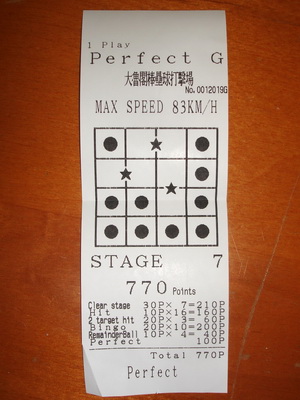 如同預期,在接連幾次殘局之後,投到了全破。而且有三次是一次中兩球,加了不少分。其實一次要中兩球實在是需要運氣,再加上最後剩下四個球未用,也加了不少分,所以這一次同時也打破最高分數的紀錄。一方面順手,另一方面又有運氣,總覺得以後要再破紀錄似乎不太可能了。