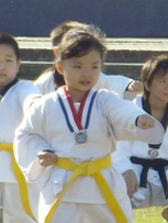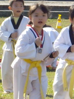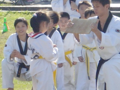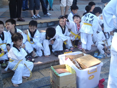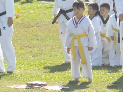 最精彩的是擊破。前面先有兩組,有踢破木板,也有劈瓦片,而蓉蓉排在最後,和她同時表演的是段數較高的藍帶及紅黃帶的小朋友,表演的項目則是連續性的先踢木板,再反身擊破瓦片。