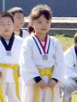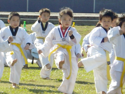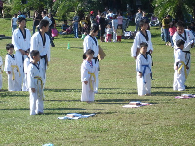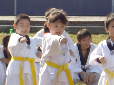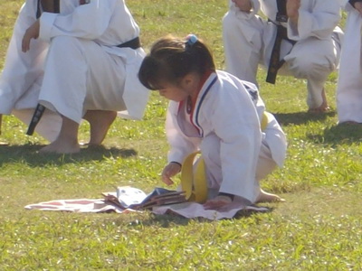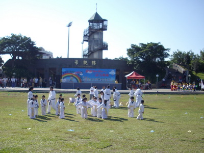 跳過一群不認識的人的開場及致詞之後,先上場的第一個節目是跆拳道表演。在表演之前,大家先在一旁集合準備,蓉蓉的服裝跟大家不同,因為是之前哥哥留給她的,所以和目前道館裡清一色黑領子的款式不同。偏偏幼稚園的跆拳道社員中,只有蓉蓉一個是女生,所以更是搶眼。
