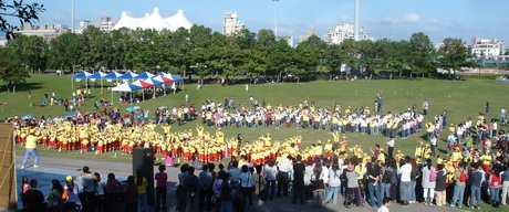 待表演開始,大家就光著腳ㄚ子到草坪中央擺開陣式。蓉蓉排在隊伍的第一排正中央的位置,女生的待遇果然特別好。
