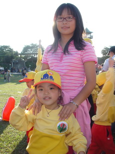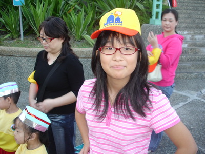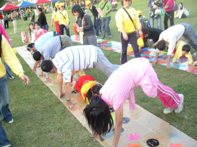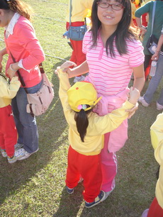 阿姨也帶著婷婷和達哥來加油,達哥早已混入安親班的小學生群中去玩了,所以一有需要家長陪同一同比賽的項目,就是婷婷來參加。家長的任務不輕,要被踩著腳前進…