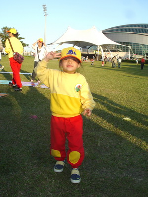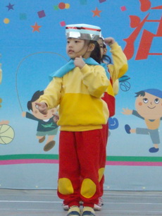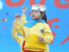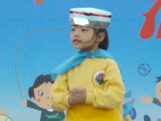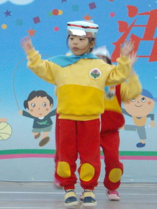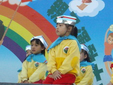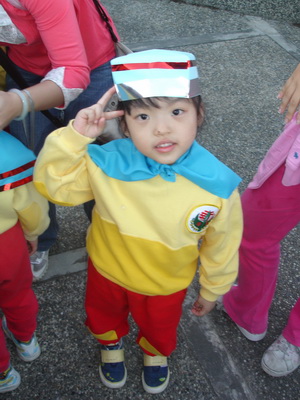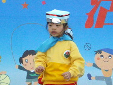 親子運動會的各個項目耗去不少時間,已超過預定結束的時間,我們也以為就要解散時,小潔卻被老師帶到後台。這時我們才知道原來小潔還要上台表演,老師快速地幫小朋友著裝,是個小水兵哩。
