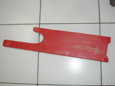 先用瓦楞紙裁切及摺疊,做出像一個扁扁的盒子,前頭及後頭的形狀也要割出來,再用壓克力顏料上色。