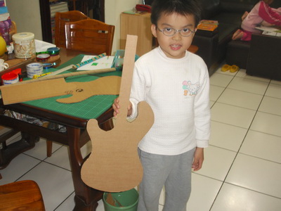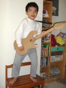 準備長的瓦楞紙 (以前買傢俱時,把較大片的箱子割下來保存著,如今都派上用場了) 及長管子 (買防潮布時,捲布的管子),做為電吉他的主要材料。