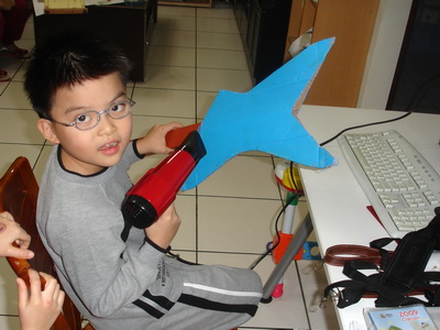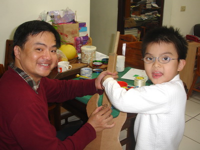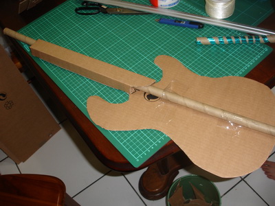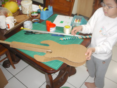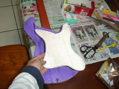 因為要將柄的部分摺起來成為一個方管子,這樣才會堅固。再把長管子固定在紙板上,一方面可增加吉他的強度,另一方面則是讓吉他有立體感。