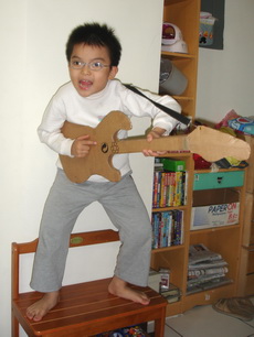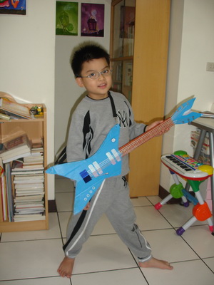電吉他有一種魔力,小孩子拿著時,根本不用教,動作就自然會出來了。