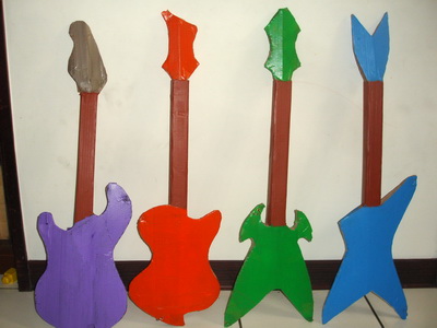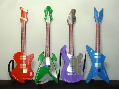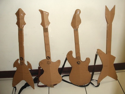 再切出另外三個形狀不一樣的瓦楞紙,同樣的做法做出共四支電吉他。