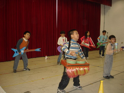 隨後便是各隊的表演。一共十八隊,而我們的出場順序在第七位。前面組的表現看來似乎都有點緊張,和比賽時略有落差,想來小朋友還是會因為場面正式而難免心存謹慎異懼之心。在快輪到我們時,老師和富翔媽媽也都到了後台幫小朋友加油,並協助帶領小朋友進場,幾個大人又是叮嚀,又是交待,又是提醒的……看看,哪個不緊張?!