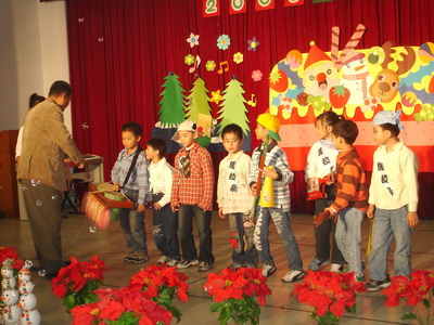 距離上次比賽結束已經半個月了,終於要在聖誕節當天登台表演。特別在前一天,利用早自習及升旗典禮的時間,把小朋友再度集合到視聽中心進行複習。免得因為時間太久,該唱的、該走的、該跳的……通通忘光光。同時也把特別要注意的事項再次強調。